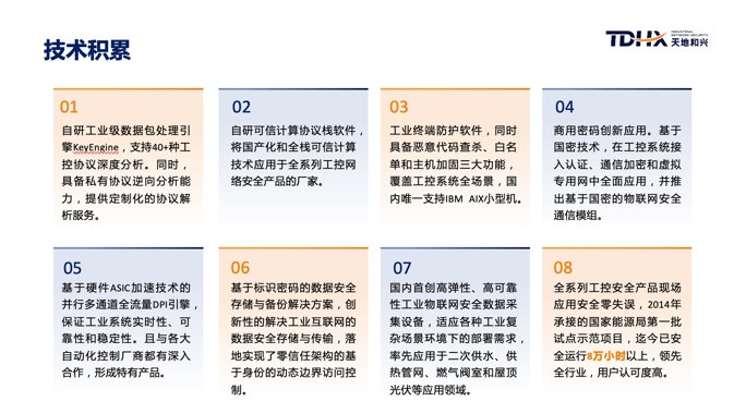 本次活動中,副總裁楊小帥更近一步向大家介紹了天地和興深厚的技術(shù)積累:自研工業(yè)級數(shù)據(jù)包處理引擎KeyEngine,支持40+種工控協(xié)議深度分析;自研可信計算協(xié)議棧軟件,是將國產(chǎn)化和全??尚庞嬎慵夹g(shù)應(yīng)用于全系列工控網(wǎng)絡(luò)安全產(chǎn)品的廠商;工業(yè)終端防護軟件,覆蓋工控系統(tǒng)全場景,還是國內(nèi)唯一支持IBM AIX小型機;商用密碼創(chuàng)新應(yīng)用,并推出基于國密的物聯(lián)網(wǎng)安全通信模組;基于硬件ASIC加速技術(shù)的并行多通道全流量DPI引擎,保證工業(yè)系統(tǒng)實時性、可靠性和穩(wěn)定性;基于標(biāo)識密碼的數(shù)據(jù)安全存儲與備份解決方案,創(chuàng)新性的解決工業(yè)互聯(lián)網(wǎng)的數(shù)據(jù)安全存儲與傳輸;國內(nèi)首創(chuàng)高彈性、高可靠性工業(yè)物聯(lián)網(wǎng)安全數(shù)據(jù)采集設(shè)備,適應(yīng)各種工業(yè)復(fù)雜場景環(huán)境下的部署需求;全系列工控安全產(chǎn)品現(xiàn)場應(yīng)用安全零失誤,2014年承接的國家能源局第一批試點示范項目,迄今已安全運行8萬小時以上。