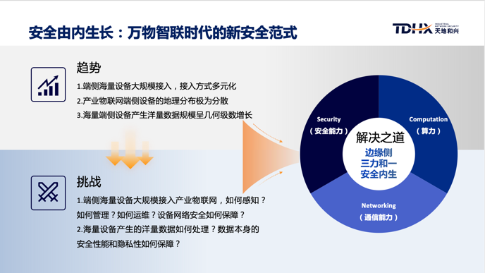 工業(yè)和信息化部研究機構(gòu)數(shù)據(jù)顯示:我國工業(yè)互聯(lián)網(wǎng)產(chǎn)業(yè)規(guī)模目前已邁過了“萬億”大關(guān),并進一步刺激了數(shù)字經(jīng)濟在工業(yè)領(lǐng)域的廣泛應(yīng)用,工業(yè)制造的數(shù)字化和網(wǎng)絡(luò)化催生出巨大的網(wǎng)絡(luò)安全需求。天地和興CTO李凱斌介紹:數(shù)字經(jīng)濟大背景下,萬物智聯(lián)時代將面臨新安全挑戰(zhàn),即:1、端側(cè)海量設(shè)備大規(guī)模接入產(chǎn)業(yè)物聯(lián)網(wǎng),如何感知?如何管理?如何運維?設(shè)備網(wǎng)絡(luò)安全如何保障?2、海量設(shè)備產(chǎn)生的洋量數(shù)據(jù)如何處理?數(shù)據(jù)本身的安全性能和隱私性如何保障?而解決之道在于“三力合一”:安全能力、算力、通信能力,三者合一。安全,由內(nèi)生長。