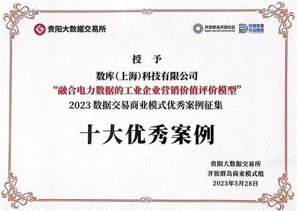值得一提的是,在此次數(shù)博會(huì)期間舉辦的中國(guó)數(shù)據(jù)首席地推官40人論壇中,數(shù)庫(kù)科技與南方電網(wǎng)貴州電網(wǎng)公司產(chǎn)出的這一創(chuàng)新成果還被授予了“2023數(shù)據(jù)交易商業(yè)模式十大優(yōu)秀案例”的殊榮: