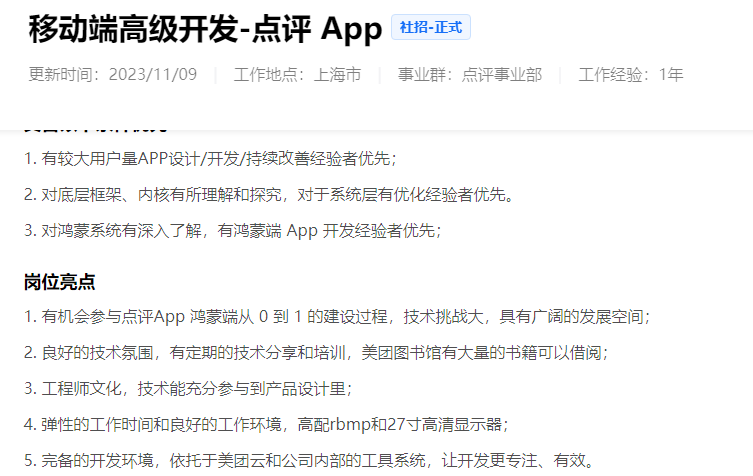 美團(tuán)發(fā)布了鴻蒙高級(jí)工程師、鴻蒙基建工程師等多個(gè)鴻蒙開發(fā)相關(guān)崗位。主要開發(fā)美團(tuán)鴻蒙App、大眾點(diǎn)評(píng)鴻蒙App。網(wǎng)易更新了高級(jí)/資深A(yù)ndroid 開發(fā)工程師崗位,職位要求參與云音樂多端多OS的產(chǎn)品(Android、鴻蒙等)研發(fā)迭代。