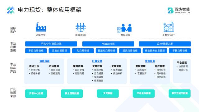 為了幫助發(fā)售電企業(yè)加速電力交易轉(zhuǎn)型,百煉智能基于先進(jìn)的AI及數(shù)據(jù)分析技術(shù)、系統(tǒng)開發(fā)能力,自主研發(fā)“百煉智電”產(chǎn)品,為發(fā)售電企業(yè)建設(shè)一站式電力現(xiàn)貨市場交易及決策平臺,強(qiáng)化企業(yè)管控水平、決策能力以及用戶服務(wù)能力,實現(xiàn)電力交易收益最大化。
