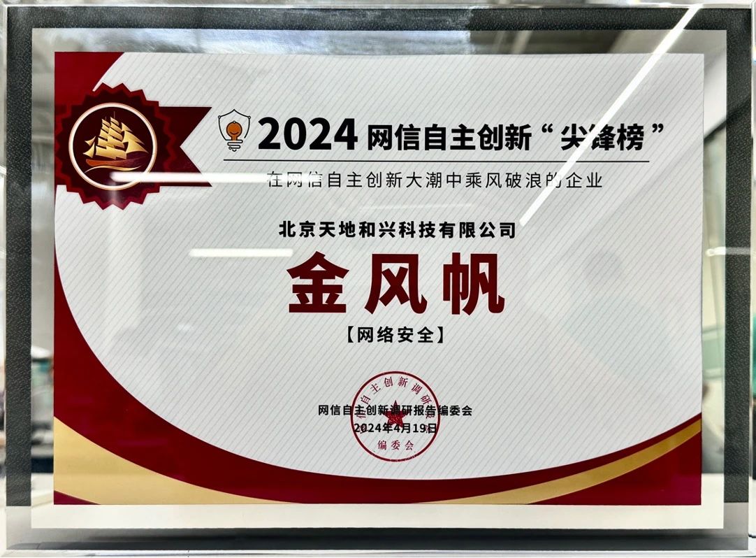在報告發(fā)布之際,報告編委會推選了具有突出創(chuàng)新能力、取得顯著創(chuàng)新成果、能夠代表創(chuàng)新水平、做出卓越創(chuàng)新貢獻的企業(yè)等予以表彰。天地和興作為在網(wǎng)信自主創(chuàng)新大潮中乘風破浪的企業(yè),被授予2024網(wǎng)信自主創(chuàng)新尖鋒榜“金風帆獎”。