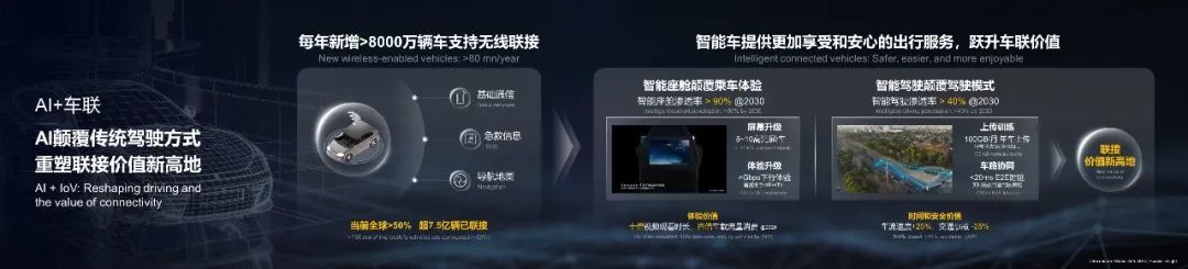 第二,智能網(wǎng)聯(lián)汽車將顛覆傳統(tǒng)駕駛方式,提供更加愉悅和安心的出行服務(wù)。智能座艙,將顛覆人們的乘車體驗。Gbps網(wǎng)絡(luò)體驗支持智慧助手、多屏觀看和XR應(yīng)用等需求,使車輛成為集休閑、娛樂和工作于一體的'移動第三空間'。智能駕駛,將顛覆傳統(tǒng)的駕駛模式。通過每月百GB的數(shù)據(jù)上傳訓(xùn)練,智駕系統(tǒng)不斷提高模型準(zhǔn)確性,精準(zhǔn)識別和響應(yīng)多樣化交通環(huán)境;同時,基于毫秒級的車路協(xié)同,將實時提供穩(wěn)定可靠的駕駛策略。智能網(wǎng)聯(lián)汽車將兌現(xiàn)車聯(lián)體驗價值,進(jìn)一步帶來時間價值和安全價值,重塑聯(lián)接價值的新高地。