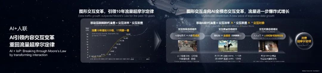 第一,圖形交互變革在過去10年推動了移動流量快速增長,DoU在過去十年增長120多倍,平均每17個月翻一番,流量增速超摩爾定律。我們認(rèn)為,移動AI時代將引領(lǐng)內(nèi)容交互的再次變革,隨著生成式內(nèi)容將會取代檢索式成為主流,交互效率百倍提升;隨著AIGC將推動3D、空間視頻等全模態(tài)內(nèi)容生產(chǎn),交互信息量百倍提升;隨著終端將內(nèi)置大量本地小模型與云端大模型實時協(xié)同,交互對象百倍提升。這將將促進(jìn)移動流量爆炸式增長,重回流量超摩爾定律。