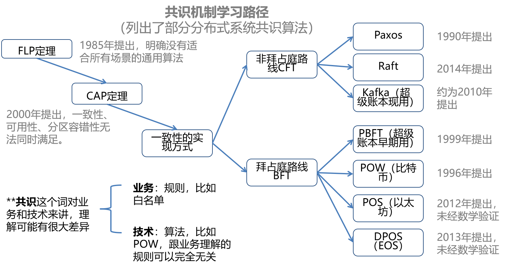 共識(shí)是區(qū)塊鏈中炒的很熱的概念,甚至?xí)尫羌夹g(shù)出身的同學(xué)覺得“共識(shí)”是區(qū)塊鏈發(fā)明的。我對(duì)共識(shí)了解不多,只是根據(jù)資料總結(jié)了一個(gè)共識(shí)的發(fā)展路徑或者說學(xué)習(xí)路徑供大家參考: