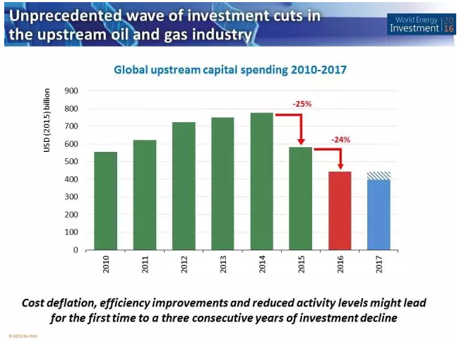 說到油氣下降,IEA首席經(jīng)濟學(xué)家LaszloVARRO介紹,石油和天然氣上游產(chǎn)業(yè)已連續(xù)兩年出現(xiàn)投資縮減,基本上甚至縮減達到50%,約30億美元。IEA預(yù)計接下來會有一個穩(wěn)定期,未來一年不會有進一步的縮減。