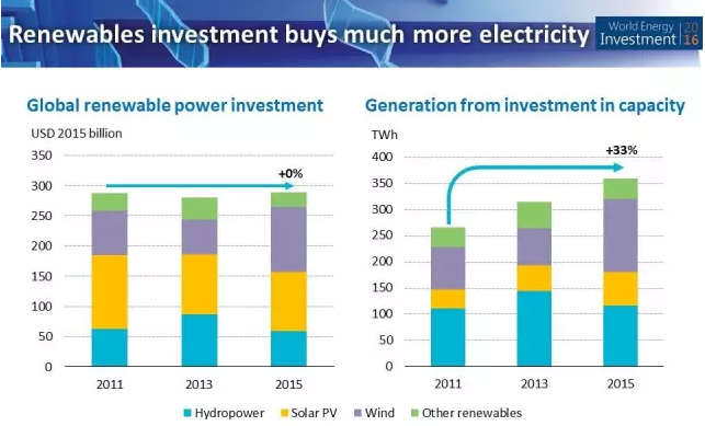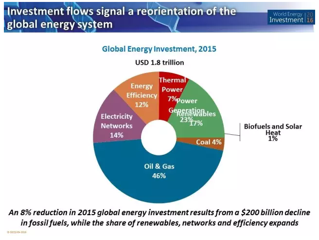 2015年電力行業(yè)投資達到了創(chuàng)紀(jì)錄的6900億美元,超過能源總投資的37%。可再生能源投資占17%,約占了電力投資的一半。可再生能源投資中,16%來自發(fā)電,生物和太陽能只占1%。
