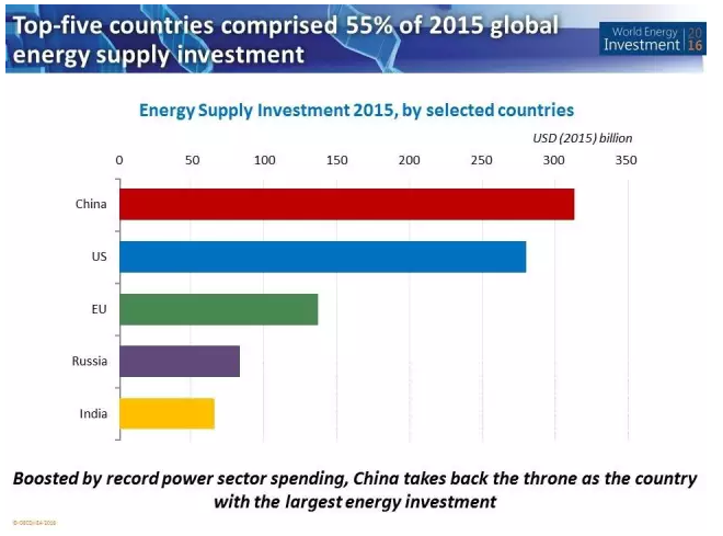LaszloVARRO介紹,在2015年中國成為全球最大的能源投資國,中國能源領(lǐng)域總投資為3150億美元,占全球能源總投資的17%。主要原因是積極推進低碳能源、智能電網(wǎng)、能效提升等政策。