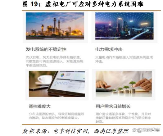 虛擬電廠具有需求側(cè)響應、多負荷管理等多種功能,可應對發(fā)電系統(tǒng)多樣化困難。虛擬 電廠可以應對發(fā)電系統(tǒng)不穩(wěn)定性(風光隨機性和間歇性對能源系統(tǒng)平衡造成挑戰(zhàn))、電力需 求沖擊(大量電動汽車隨機接入,對能源系統(tǒng)造成沖擊)、調(diào)控難度大(分布式能源增多, 導致動態(tài)調(diào)度與控制難度提升)和用戶需求日益提升等多種困難。