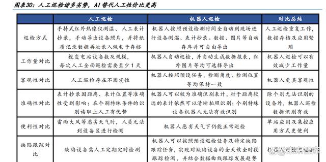 人工巡檢諸多劣勢,AI 替代是大勢所趨。電力行業(yè)有大量巡檢工作條件惡劣,傳統(tǒng)人工 巡檢的工作難度大、危險指數(shù)高、及時性低、工作量大;采用智能巡檢,既具有人工巡檢 的靈活性和智能性,同時響應(yīng)更加及時、效率更高、成本更低,隨著技術(shù)的發(fā)展,智能機(jī) 器人技術(shù)具有廣闊的應(yīng)用前景,未來電氣行業(yè)無人化巡檢將成為行業(yè)常態(tài)。 AI 替代人工性價比更高。以 500kv 變電站為例,人工巡檢模式下需要 4 個工人耗費一個 禮拜的工時才能進(jìn)行一次全面檢查,假設(shè)每位工人年薪約 8 萬,而同樣的工作量,一臺巡 檢機(jī)器人能在更短的時間內(nèi)完成,其平均成本為 65 萬/臺,計提折舊后約 16 萬/年,使 用巡檢機(jī)器人比人工巡檢能節(jié)約 16 萬/年。