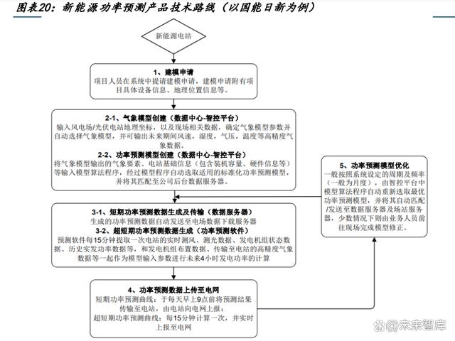 新能源功率產(chǎn)品每日工作流程(以國能日新產(chǎn)品為例):①獲得原始?xì)庀箢A(yù)報數(shù)據(jù)、②通 過建模計算后得到更高精度的氣象預(yù)測數(shù)據(jù)、③進(jìn)行短期功率預(yù)測數(shù)據(jù)計算、④傳輸短期 功率數(shù)據(jù)到所服務(wù)電站、⑤在電站軟件中進(jìn)行超短功率預(yù)測、⑥報送數(shù)據(jù)至電網(wǎng)調(diào)度部門。
