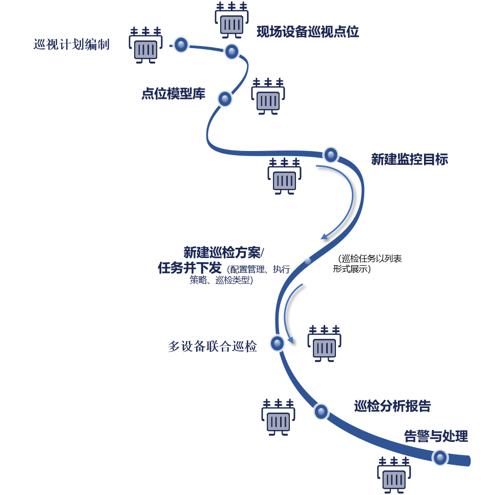 同時,針對變電站內(nèi)攝像機、機器人、無人機、在線監(jiān)測等多種感知及智能巡視設備間缺乏聯(lián)動機制現(xiàn)象,江行智能開發(fā)變電遠程智能巡視系統(tǒng),可將上述多種智能巡視設備納入系統(tǒng)管控,并設計聯(lián)合巡檢策略,最大程度挖掘智能設備價值,提升設備利用率及巡視作業(yè)智能化水平。