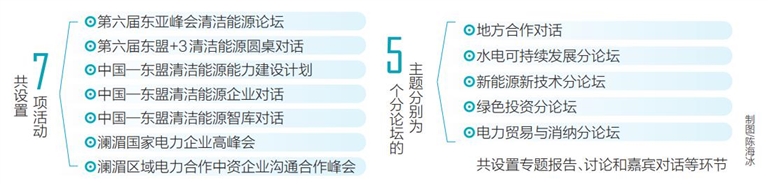 本次中國(guó)—東盟清潔能源合作周以“跨越山海 共享未來(lái)”為主題,活動(dòng)期間將舉辦第六屆東亞峰會(huì)清潔能源論壇、第六屆東盟+3清潔能源圓桌對(duì)話、中國(guó)—東盟清潔能源能力建設(shè)計(jì)劃、中國(guó)—東盟清潔能源企業(yè)對(duì)話、中國(guó)—東盟清潔能源智庫(kù)對(duì)話、瀾湄國(guó)家電力企業(yè)高峰會(huì)、瀾湄區(qū)域電力合作中資企業(yè)溝通合作峰會(huì)等7項(xiàng)活動(dòng)。5場(chǎng)分論壇的主題分別為“地方合作對(duì)話”“水電可持續(xù)發(fā)展分論壇”“新能源新技術(shù)分論壇”“綠色投資分論壇”“電力貿(mào)易與消納分論壇”,設(shè)置了專題報(bào)告、討論和嘉賓對(duì)話等環(huán)節(jié)。