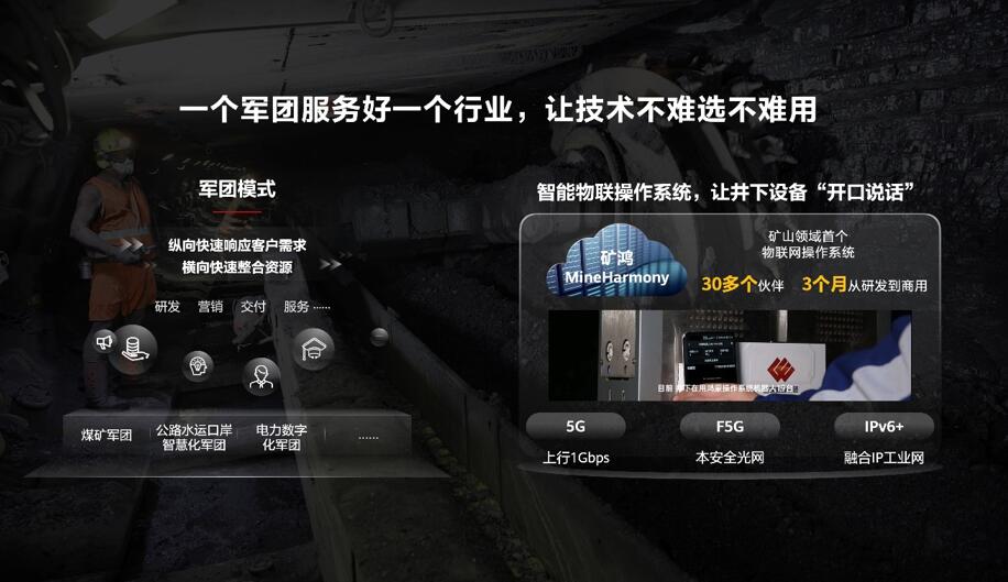 為了幫助企業(yè)選好技術(shù)、用好技術(shù),另一個關(guān)鍵措施就是成立軍團(tuán)。自去年底,我們已面向煤礦、港口、電力等多個行業(yè)成立了多個軍團(tuán)組織。軍團(tuán)是專業(yè)化隊(duì)伍,一方面,對內(nèi)拉通端到端的資源,包括研發(fā)、銷售、交付、服務(wù)等,以便深入理解行業(yè)的生產(chǎn)實(shí)踐和行業(yè)知識,打造適配場景的產(chǎn)品和解決方案;另一方面,對外聯(lián)合更多的解決方案伙伴,把華為和伙伴的能力整合在一起,形成針對性的解決方案。