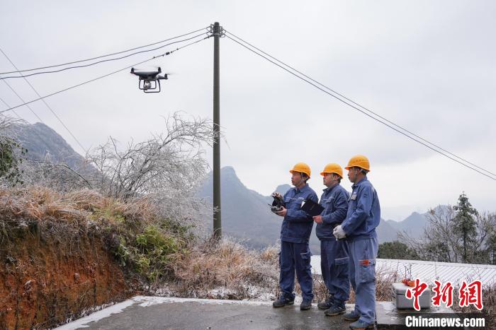 1月23日,南方電網(wǎng)廣東清遠(yuǎn)陽(yáng)山供電局陽(yáng)城供電所工作人員采取“人巡+機(jī)巡”模式,觀察、記錄供電線路和配電設(shè)備的覆冰情況。(廣東電網(wǎng)公司供圖)