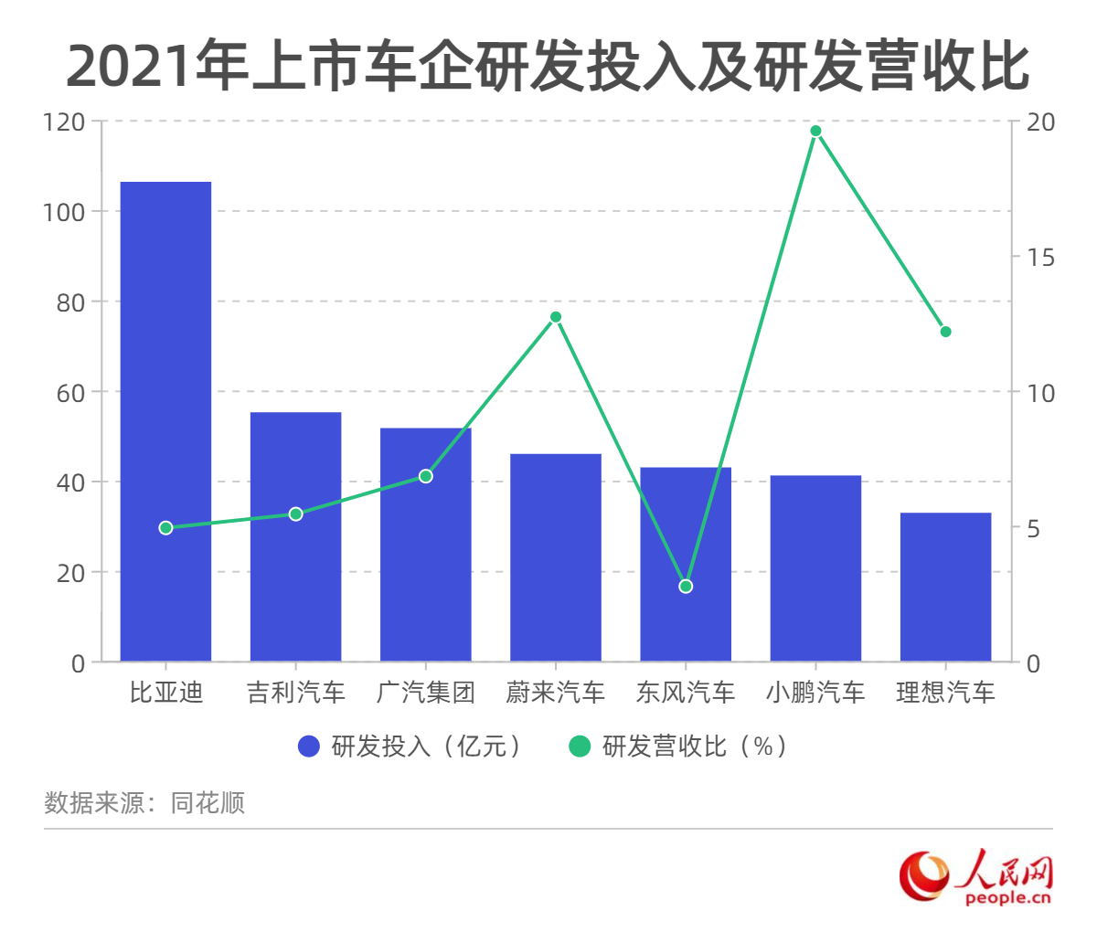 從各家車企的研發(fā)投入來看,A股比亞迪、北汽藍(lán)谷2021年研發(fā)投入同比分別增長(zhǎng)24.2%、24.1%,中概股“蔚小理”研發(fā)投入同比分別增長(zhǎng)86.4%、138.4%和198.8%。