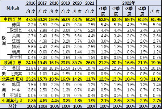 中國(guó)在世界純電動(dòng)車市場(chǎng)份額表現(xiàn)相對(duì)突出,2017-2018年是在60%左右的份額;2019-2020年份額稍微有所下降,降到2020年的48%的份額;2021年又回升到60%的份額;2022年1-12月的份額達(dá)到66%的份額水平,表現(xiàn)相對(duì)優(yōu)秀。