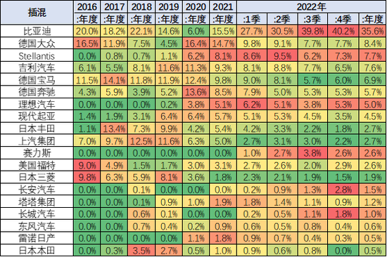 從車企的純電動(dòng)份額來(lái)看,比亞迪的份額總體來(lái)看持續(xù)上升,從2017-2021年總體保持在7%以上的份額水平,但2022年的份額上升到12%,表現(xiàn)良好。