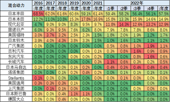 混合動(dòng)力市場(chǎng)是日韓有效的控制,豐田、本田、日產(chǎn)和現(xiàn)代的混動(dòng)表現(xiàn)很強(qiáng),占據(jù)93%。其他大部分企業(yè)的混動(dòng)份額均不超過(guò)1%。長(zhǎng)城在1季度的混動(dòng)市場(chǎng)份額表現(xiàn)較強(qiáng),也是產(chǎn)品突破的機(jī)遇。