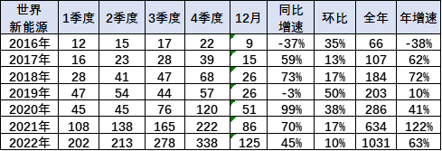 *2022年世界新能源乘用車走勢(shì)較強(qiáng),1-12月達(dá)到1031萬(wàn)臺(tái),同比增長(zhǎng)63%。其中12月銷量125萬(wàn)臺(tái),同比增長(zhǎng)45%。