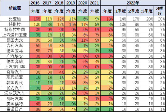 從歷年銷量份額看,特斯拉保持世界第一,目前持續(xù)走強(qiáng)。中國(guó)的比亞迪(294.540, -8.08, -2.67%)和上汽集團(tuán)(14.820, -0.14, -0.94%)的新能源表現(xiàn)優(yōu)秀,上汽乘用車和上汽五菱兩家自主車企表現(xiàn)很好。德國(guó)大眾的新能源車表現(xiàn)較強(qiáng),2021年受到疫情嚴(yán)重影響,加之去年年末沖刺,年初走勢(shì)偏弱。寶馬集團(tuán)、德國(guó)奔馳等保持在第二梯隊(duì)水平。