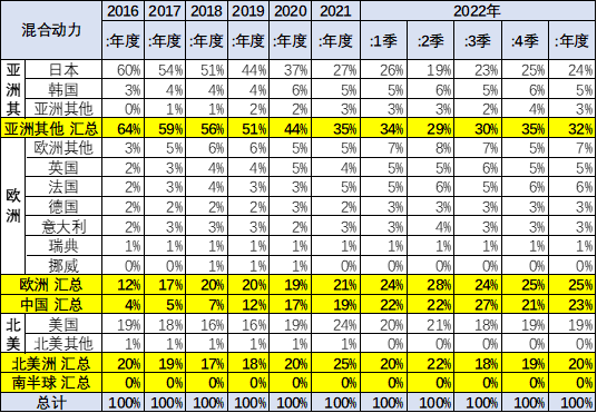 中國(guó)近兩年混動(dòng)高速發(fā)展,2022年成為世界較大的混動(dòng)市場(chǎng),超越美國(guó)成為超強(qiáng)主力。