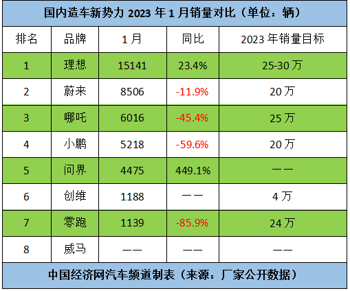 與之形成鮮明對照的是,1月,7家國內(nèi)造車新勢力的銷量環(huán)比上個月都呈現(xiàn)不同幅度的下滑;從銷量同比增幅來看,除理想和問界實現(xiàn)正增長外,其他品牌則有不同程度下滑。數(shù)據(jù)顯示,1月,理想、蔚來、哪吒、小鵬、賽力斯、創(chuàng)維和零跑的銷量分別為15141輛、8506輛、6016輛、5218輛、4475輛、1188輛、1139輛。