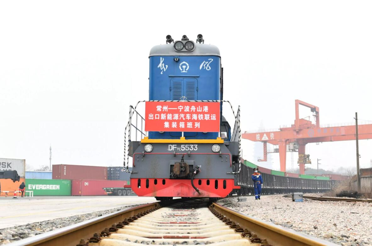 2月8日,在常州站鐵路貨場(chǎng),裝載新能源汽車(chē)的海鐵聯(lián)運(yùn)鐵路班列即將發(fā)車(chē)。新華社發(fā)(史康 攝)