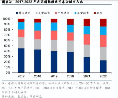前述華泰報(bào)告顯示,當(dāng)前我國(guó)縣鄉(xiāng)地區(qū)占整體新能源車市場(chǎng)的比重較低,與全國(guó)平均水平有巨大差距,與特大城市及大型城市更是有巨大鴻溝。
