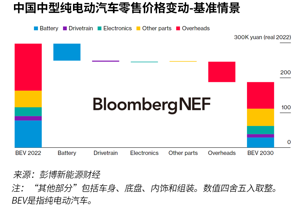 降低成本對(duì)新能源車(chē)企至關(guān)重要,因?yàn)榇蠖鄶?shù)車(chē)企尚未從新能源汽車(chē)的銷(xiāo)售中獲利。彭博新能源財(cái)經(jīng)估計(jì),從2022年到2030年底,電池價(jià)格下跌以及轉(zhuǎn)用專(zhuān)用平臺(tái)可能會(huì)使中國(guó)純電動(dòng)汽車(chē)價(jià)格下降40%。結(jié)合其他零部件和系統(tǒng)的改進(jìn),這可能會(huì)推動(dòng)純電動(dòng)汽車(chē)在2027年至2029年間實(shí)現(xiàn)燃油車(chē)平價(jià)。更廉價(jià)的電池、平臺(tái)協(xié)同效應(yīng)和產(chǎn)業(yè)價(jià)值鏈整合也是大眾汽車(chē)和比亞迪等公司成本降低路線(xiàn)圖的核心。