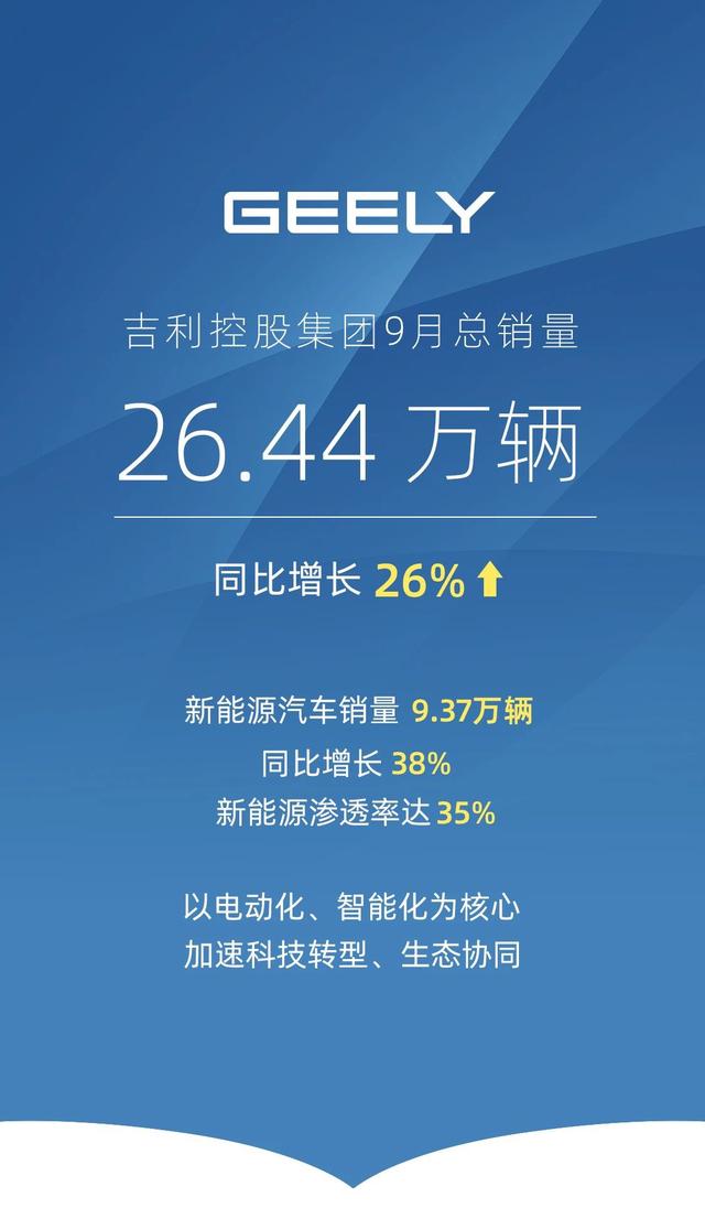 從吉利控股集團(tuán)官方公告獲悉,吉利控股集團(tuán) 9 月汽車(chē)總銷(xiāo)量 26.44 萬(wàn)輛,同比增長(zhǎng) 26%。新能源汽車(chē)銷(xiāo)量 9.37 萬(wàn)輛,同比增長(zhǎng) 38%,新能源滲透率為 35%。