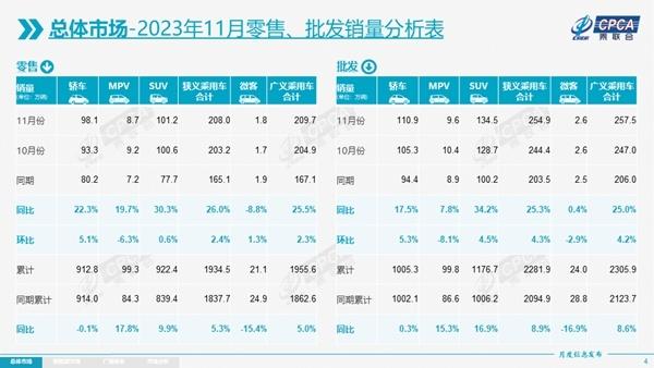 展望12月,共有21個工作日,較上一年減少一天,考慮到元旦假期因素,乘聯(lián)會預計年內部分銷量將轉結至2024年兌現(xiàn)。同時,1-11月乘用車市場表現(xiàn)顯著好于預期,全年銷量再創(chuàng)歷史新高十拿九穩(wěn),因此車企年末的沖刺熱情不會很高。此外,今年受新能源車的持續(xù)走高助推,多月份表現(xiàn)出淡季不淡的特點,但也令旺季難旺,整體走勢相對平穩(wěn);加之新能源補貼措施退出,以及去年12月燃油車購置稅優(yōu)惠結到期,因此今年12月消費者購買熱情將低于往年。
