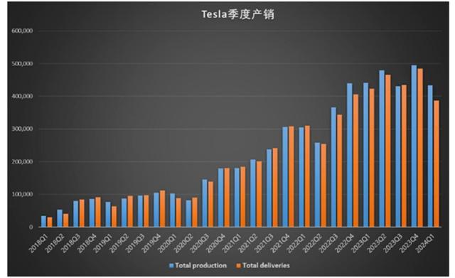 今年一季度,特斯拉的全球交付量為38.7萬輛,同比下降8.5%,環(huán)比下降20.2%;全球產(chǎn)量為43.3萬輛,同比下降1.7%,環(huán)比下降12.4%,這是特斯拉歷史上首次產(chǎn)銷量出現(xiàn)同比和環(huán)比的雙雙下降。
