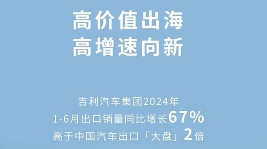 昨日,吉利汽車發(fā)布數(shù)據(jù)顯示,2024年上半年吉利汽車出口累計(jì)銷量達(dá)19.74萬(wàn)輛,同比增長(zhǎng)67%,高于中國(guó)汽車出口大盤(pán)兩倍,銷量、增速均創(chuàng)歷史新高。