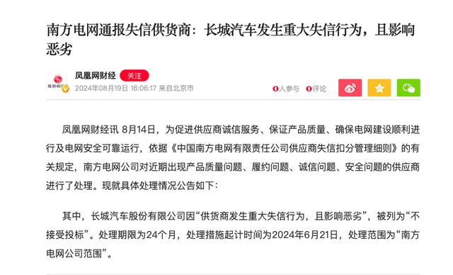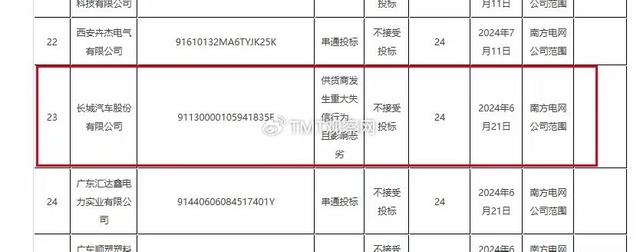 其中,長城汽車股份有限公司因“供貨商發(fā)生重大失信行為,且影響惡劣”,被列為“不接受投標”。處理期限為24個月,處理措施起計時間為2024年6月21日,處理范圍為“南方電網公司范圍”。