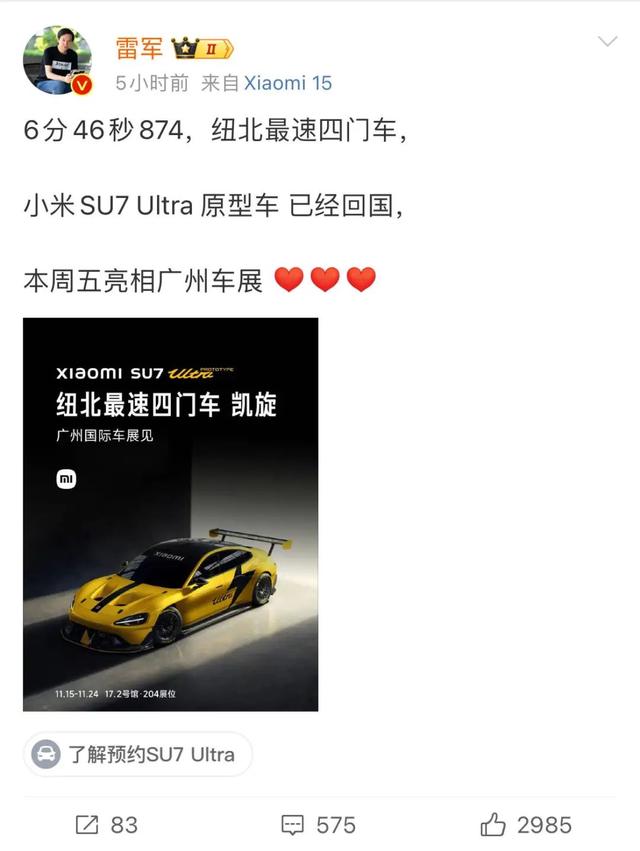 11月12日,雷軍在微博高調宣布:“小米SU7 Ultra原型車已經回國,并將于廣州車展上正式亮相。”據(jù)了解,該車定位為巔峰性能科技轎車,定價為81.49萬元。然而,即便如此,在預訂開啟僅10分鐘內,小訂量就突破了3680臺。