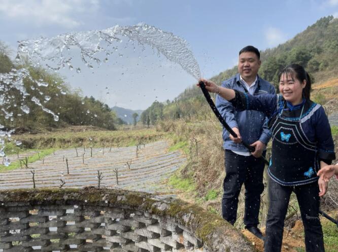 劉彬(左一)協(xié)調(diào)下瓦窯村生態(tài)農(nóng)業(yè)項(xiàng)目實(shí)現(xiàn)了通電引水(貴陽供電局供圖)。