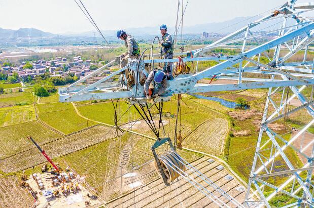 4月11日7時(shí)30分,在安徽省寧國市港口鎮(zhèn)水陽江江畔的宣績(jī)高鐵線路遷移改造工程現(xiàn)場(chǎng),施工班前會(huì)準(zhǔn)時(shí)開始,施工負(fù)責(zé)人再次說明當(dāng)天工作內(nèi)容、任務(wù)和安全須知。隨后,伴隨著巨大的轟鳴聲,張力機(jī)和牽引機(jī)啟動(dòng),幾名施工人員攀上新建的52號(hào)直線塔,在近百米的高空中展放導(dǎo)線。