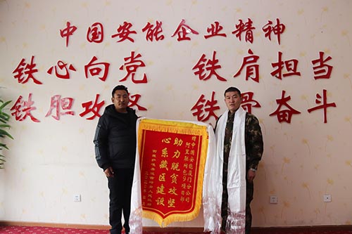 3月底,薩嘎縣達(dá)吉嶺鄉(xiāng)派出所營(yíng)區(qū)計(jì)劃進(jìn)行整體硬化,但由于當(dāng)?shù)亟ㄔO(shè)經(jīng)費(fèi)緊張,一直未能批復(fù)。何樂(lè)鋒在了解當(dāng)?shù)氐睦щy后,主動(dòng)為他們捐贈(zèng)了20噸水泥,解決了他們建設(shè)的燃眉之急,有效改善了派出所的辦公生活條件。嶺鄉(xiāng)派出所所長(zhǎng)旦增扎巴專程來(lái)到項(xiàng)目部,為全體人員獻(xiàn)上潔白的哈達(dá),為項(xiàng)目部贈(zèng)送了印有“心系藏區(qū)建設(shè),助力脫貧攻堅(jiān)”內(nèi)容的錦旗和感謝信,“中國(guó)安能為我們幫了大忙,建設(shè)阿里聯(lián)網(wǎng)工程為我們送電,為我們解決務(wù)工難題,還支持我們建設(shè),我受我們鄉(xiāng)書記委托,專程過(guò)來(lái)感謝你們,我們達(dá)吉嶺鄉(xiāng)全鄉(xiāng)人民都感謝你們!”他緊握項(xiàng)目經(jīng)理何樂(lè)峰的雙手,動(dòng)情地說(shuō)道。