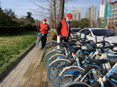 圖為“紅馬甲”整理擺放共享單車(chē)