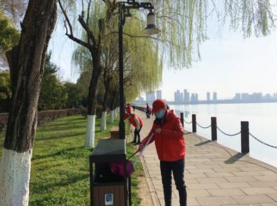 圖為“紅馬甲”清理步道垃圾