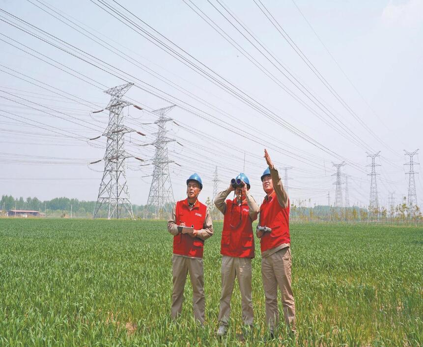 國(guó)家電網(wǎng)天津電力心連心(送變電)共產(chǎn)黨員服務(wù)隊(duì)隊(duì)員在第七屆世界智能大會(huì)期間巡檢輸電線路。