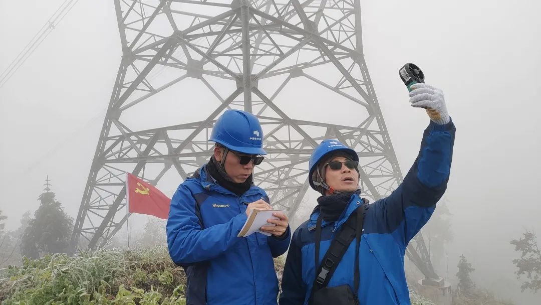 南方電網(wǎng)超高壓公司柳州局黨員突擊隊(duì)在500千伏線路所在地測(cè)量風(fēng)速、濕度,量冰厚、觀冰情。(焦偉軍 攝)