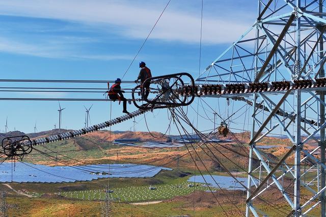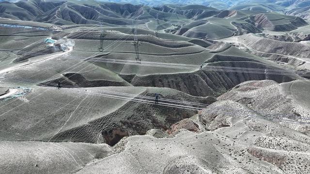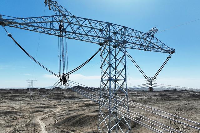 國網(wǎng)甘肅電力施工人員在哈密—重慶±800千伏特高壓直流輸電工程開展架線自檢。