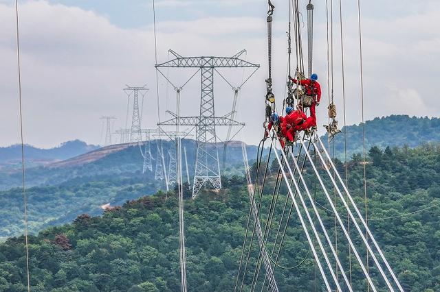 國網(wǎng)寧夏送變電公司施工人員在寧夏—湖南±800千伏特高壓直流輸電工程進(jìn)行平衡掛線作業(yè)。