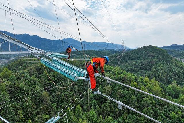 國網(wǎng)浙江送變電公司員工安裝金上—湖北±800千伏特高壓直流輸電線路工程導(dǎo)線間隔棒。