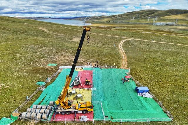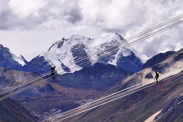 國網(wǎng)青海送變電公司施工人員在玉樹II回330千伏線路工程展放導(dǎo)線。