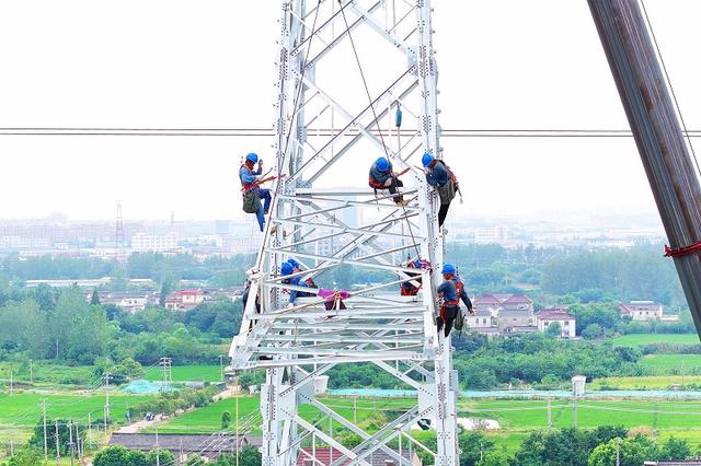 國網(wǎng)江蘇揚(yáng)州供電公司施工人員在220千伏鳳蜀線路工程立塔作業(yè)。