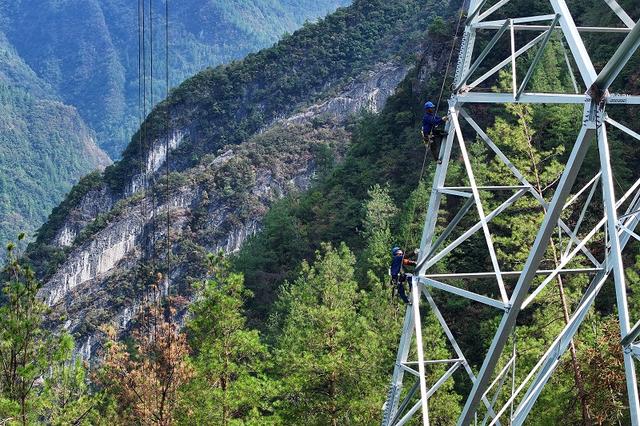 國網(wǎng)四川電力施工人員在川渝1000千伏特高壓交流工程登塔作業(yè)。
