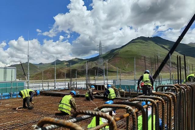 國網(wǎng)河南送變電建設(shè)有限公司施工人員在青藏聯(lián)網(wǎng)二期工程±400千伏拉薩換流站開展鋼筋綁扎作業(yè)。